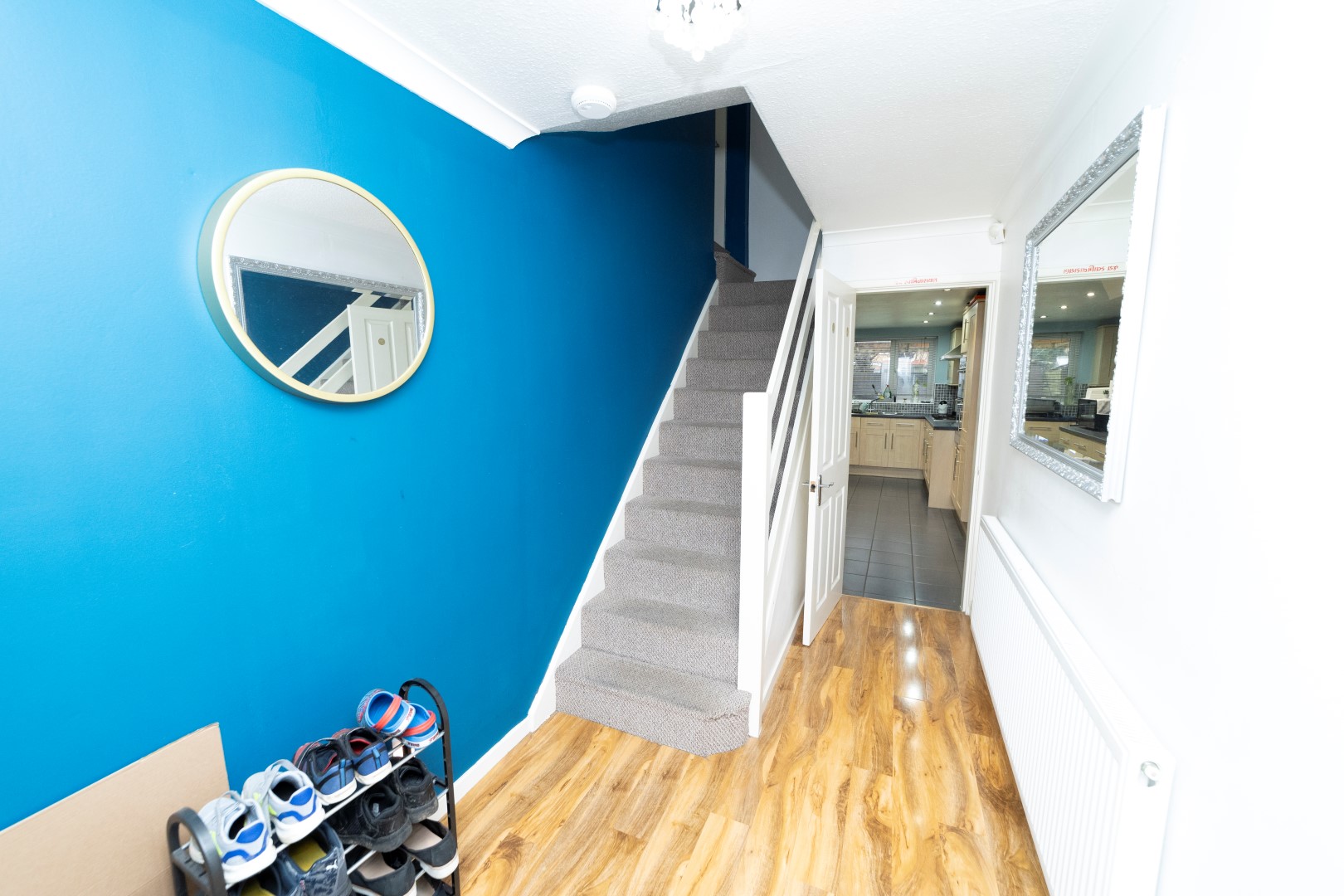 Entrance Hall- Laminated flooring , Radiator, Cloaks cupboard and Stairs leading to the first floor and doors to:-