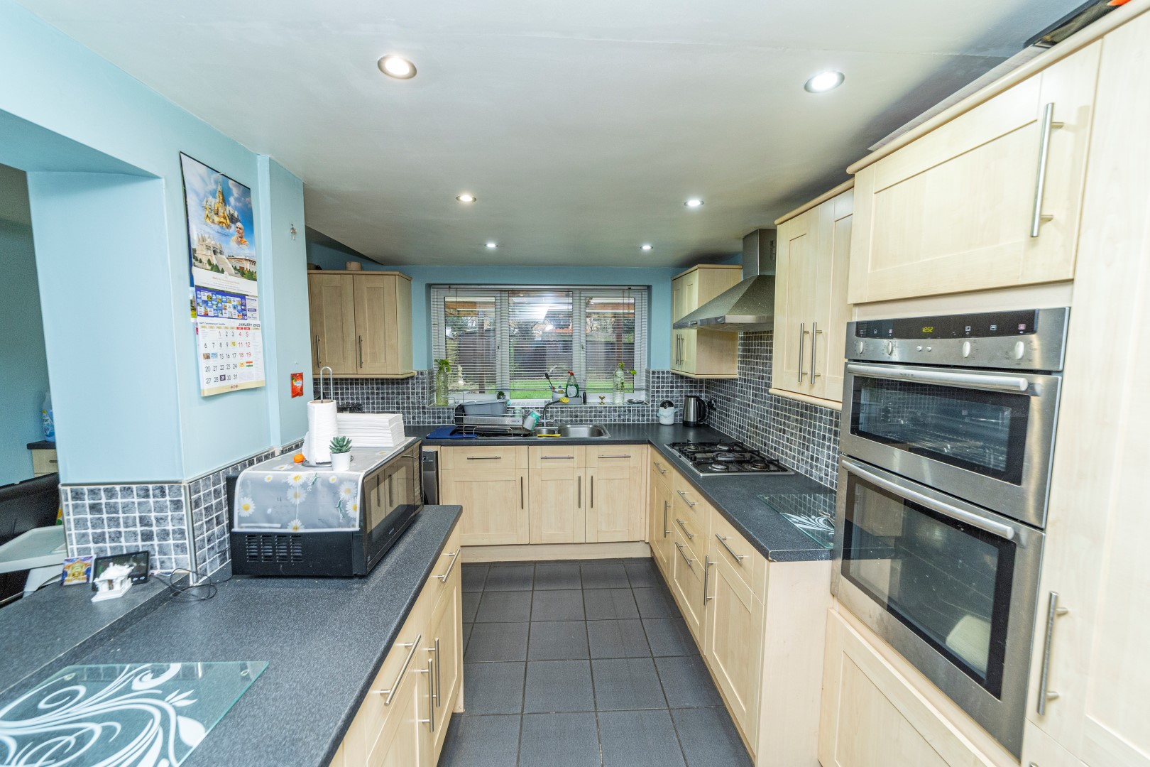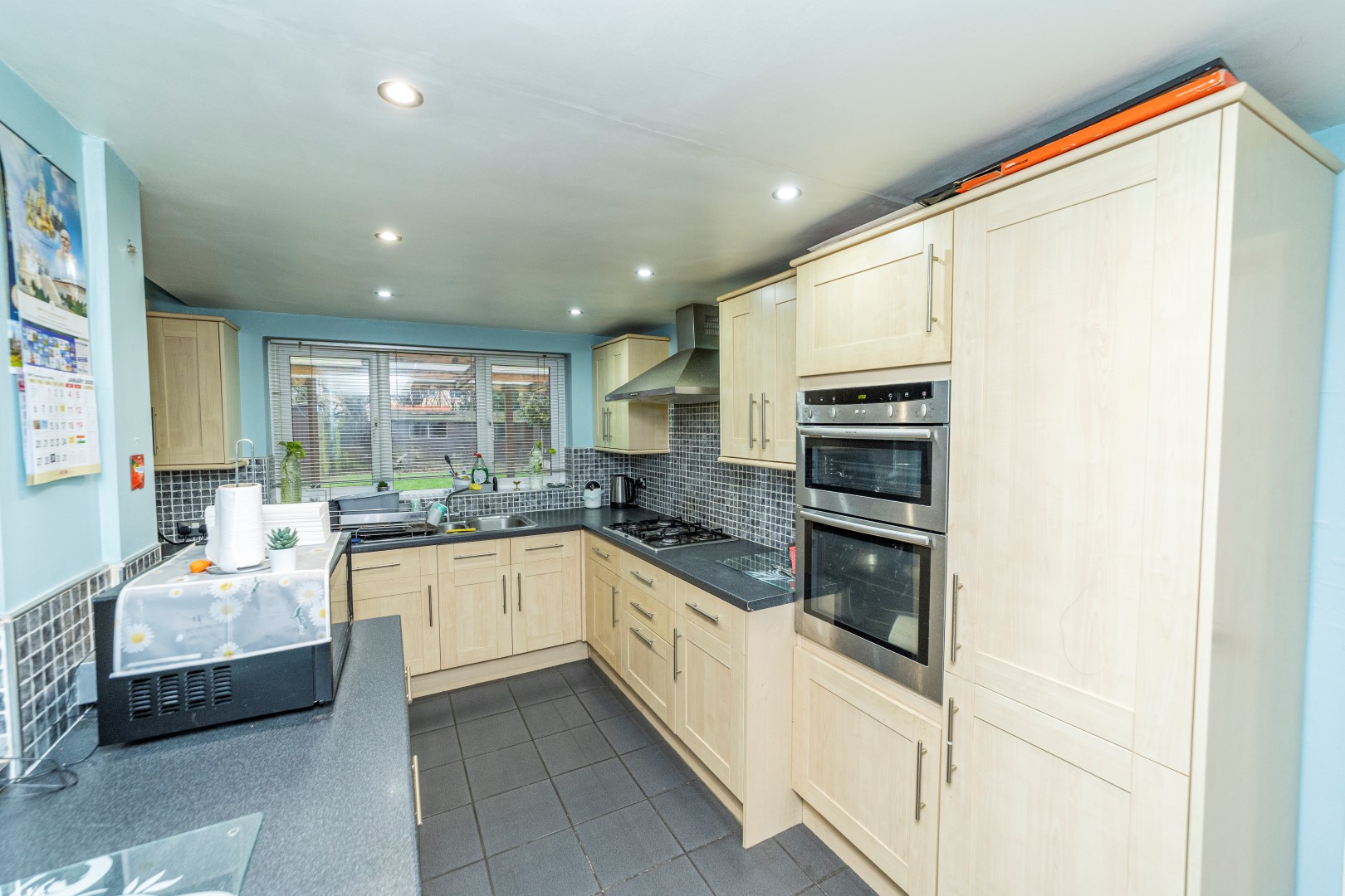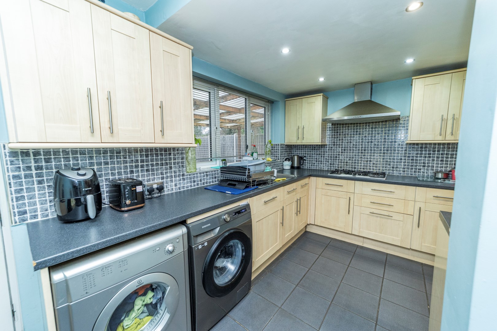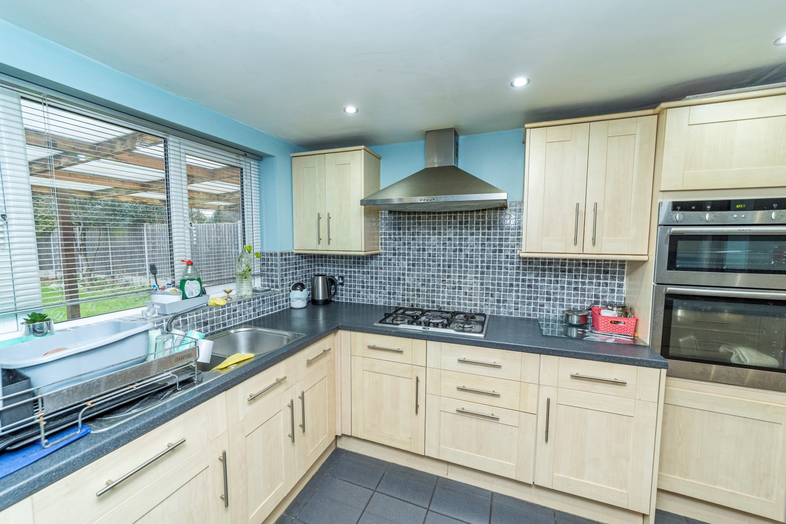 Dining Kitchen - A beautiful and stunning extended Dining kitchen with ceramic tiles flooring and under floor heating , ceramic tiled splash back, fully fitted Kitchen include wide range of Shaker style in light oak with a rolled edge granite effect work surface, stainless steel sink and drainer with mixer tap, gas hob with stainless steel extractor fan, integrated appliances include electric oven and grill, dishwasher, under counter fridge freezer, space for washing machine and tumble dryer, double glazed window to the rear elevation, spotlights, radiator, double glazed door to the garden and a internal door leading to:-