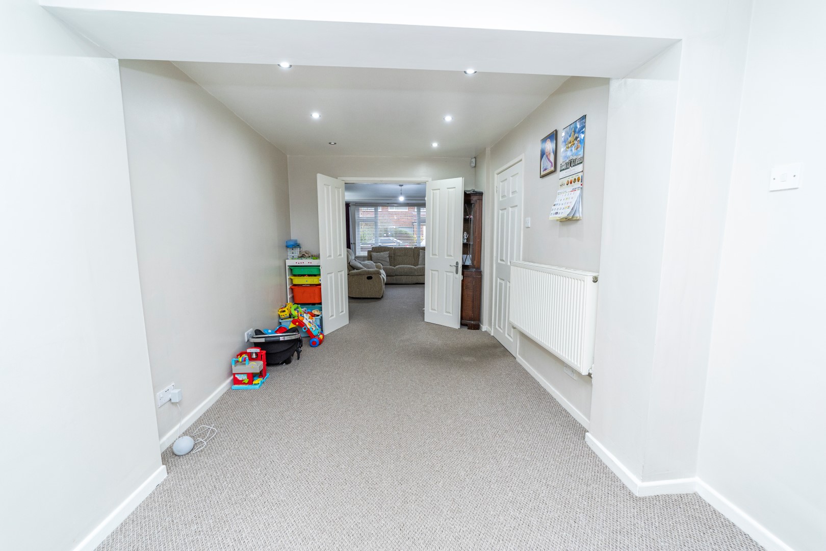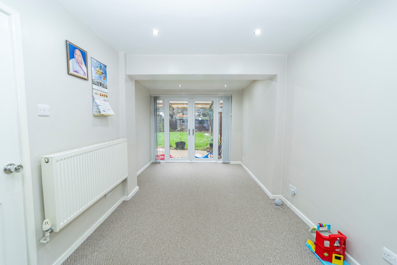 Dining Room- Double glazed French doors, radiator , spot lights , power points and doors leading out to the garden and doors to Dining kitchen