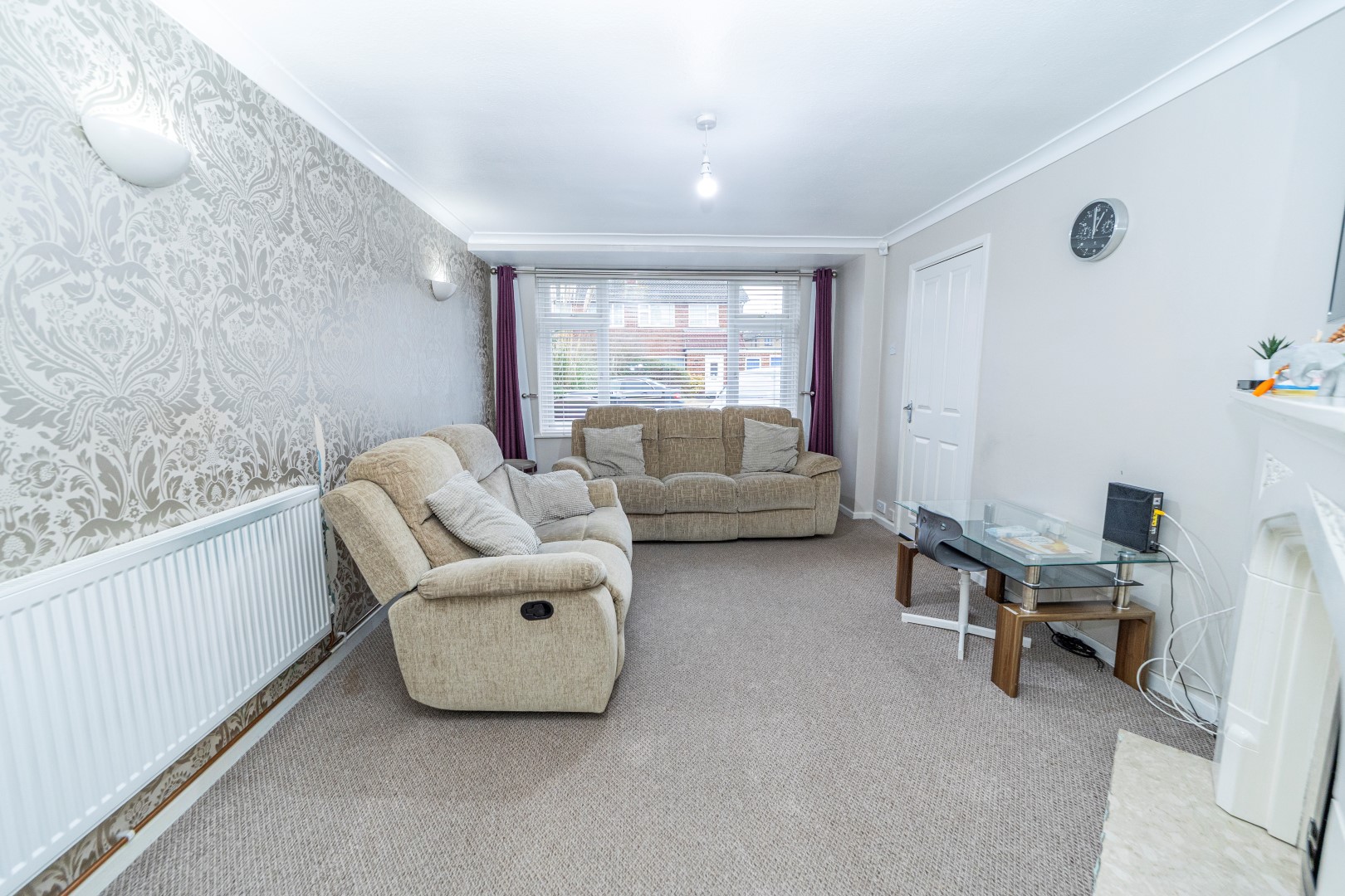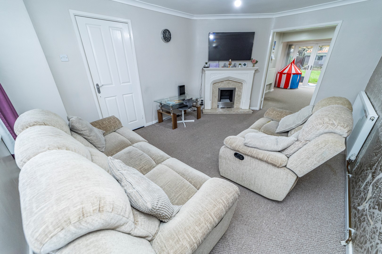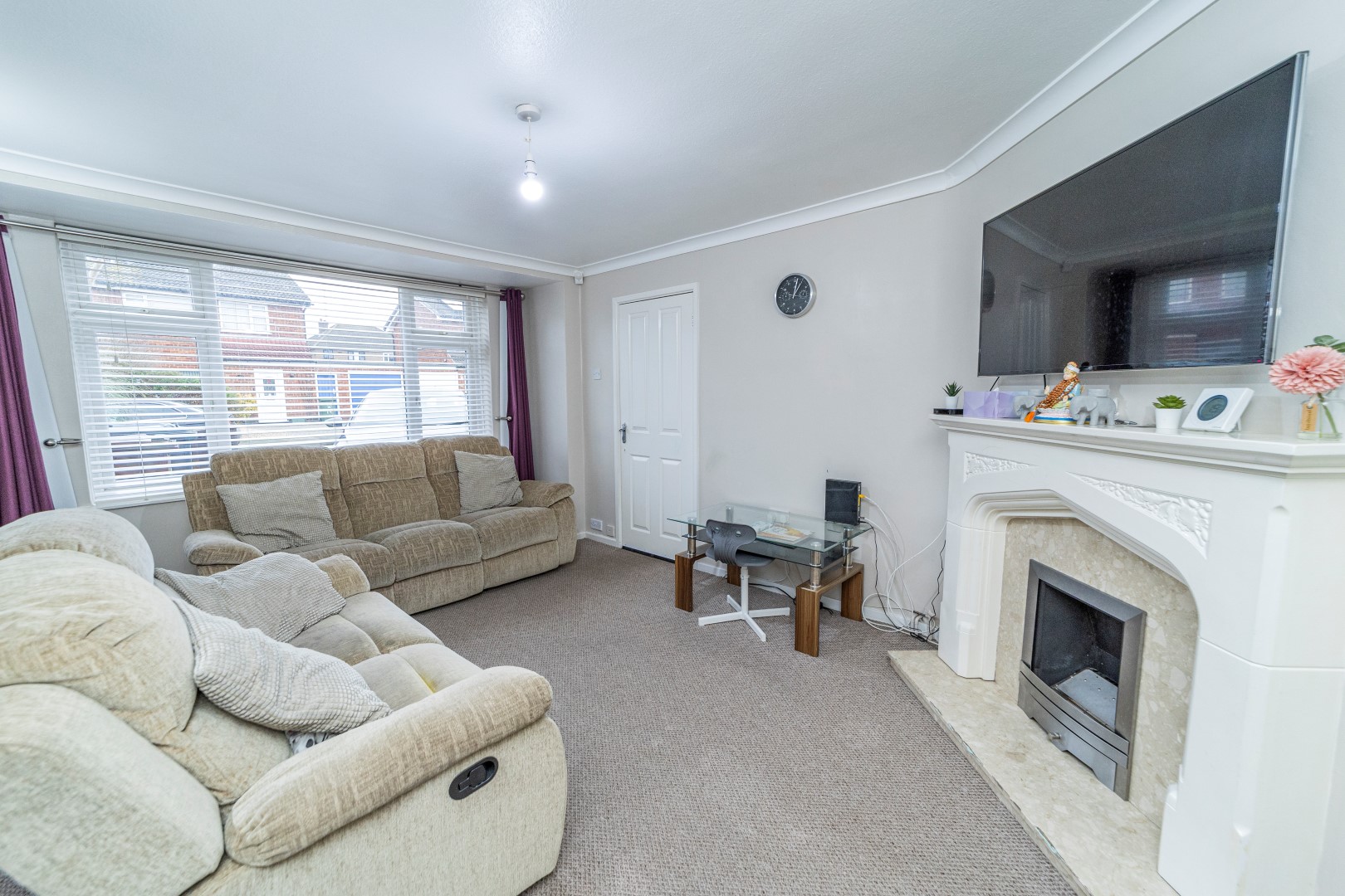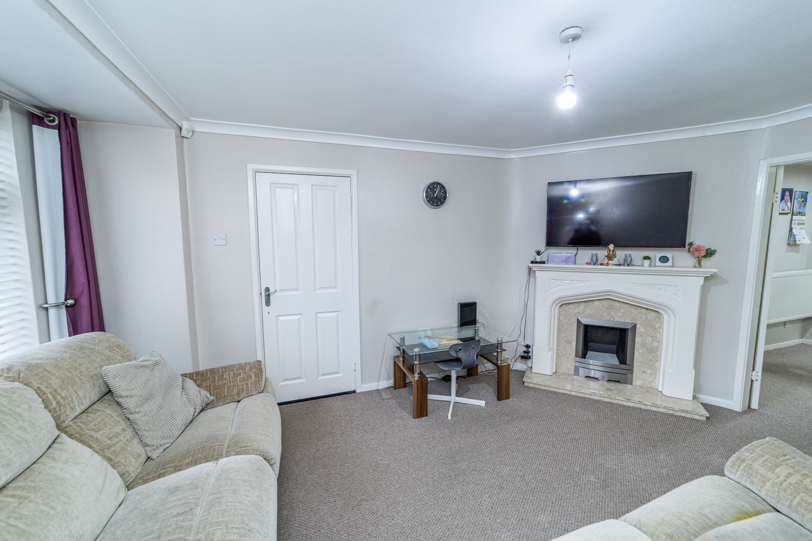 Living Room - Double glazed window to the front elevation, gas fire with marble surround, power points, double doors leading to:-