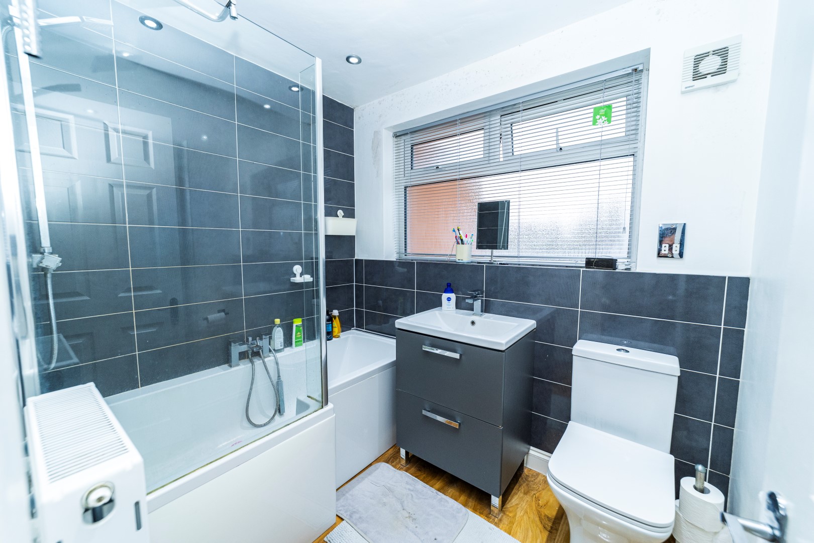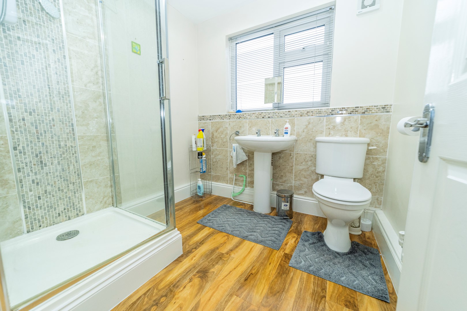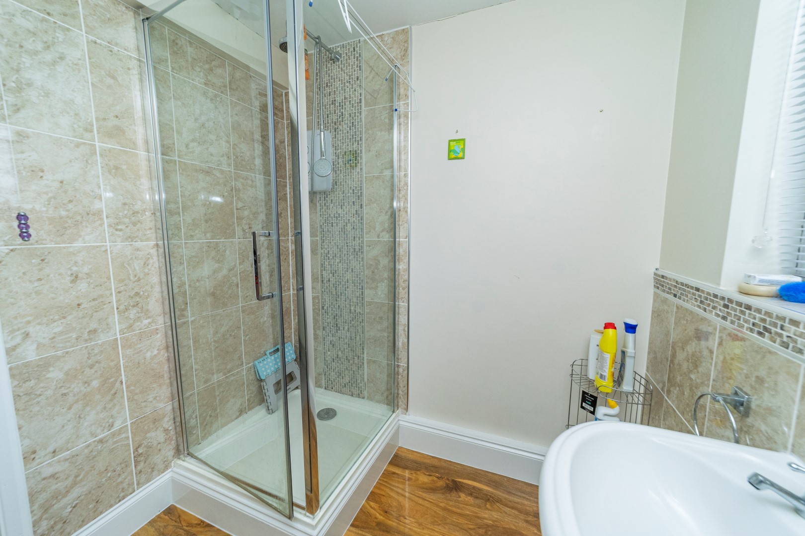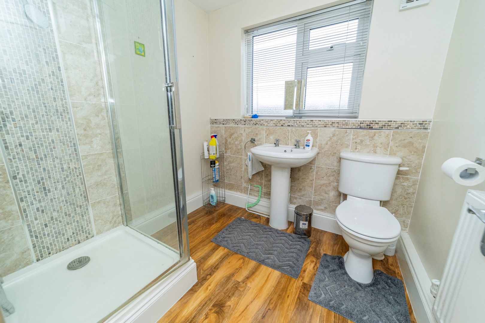 En-Suite- Laminate flooring and fitted with a tiled shower cubicle, low flush WC, pedestal wash hand basin, radiator, ceramic tiling, extractor fan and UPVC double glazed window to the rear elevation.