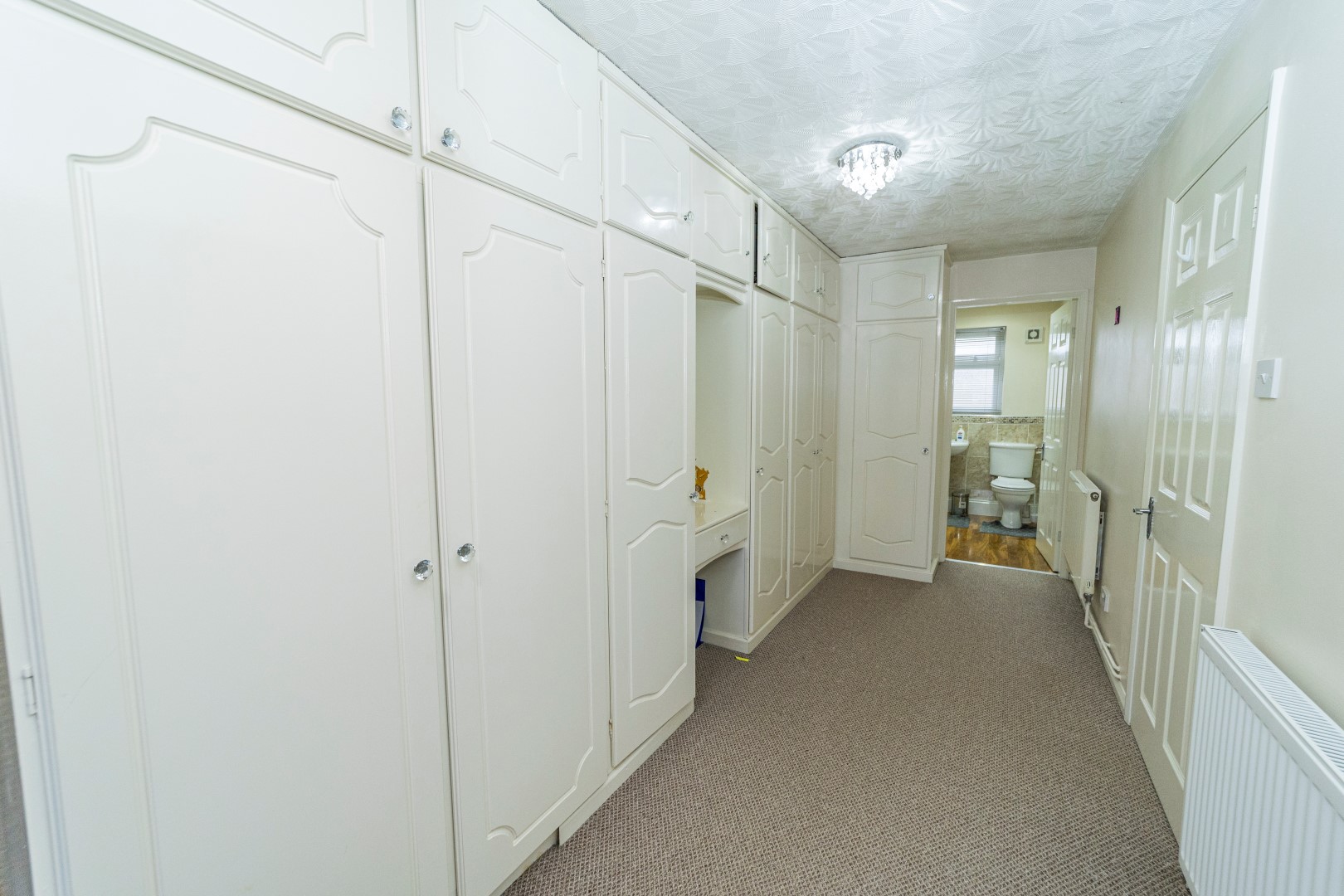 Bedroom Three- with fitted wardrobes , two radiators, power points, UPVC double glazed window to the front elevation and a door to:-