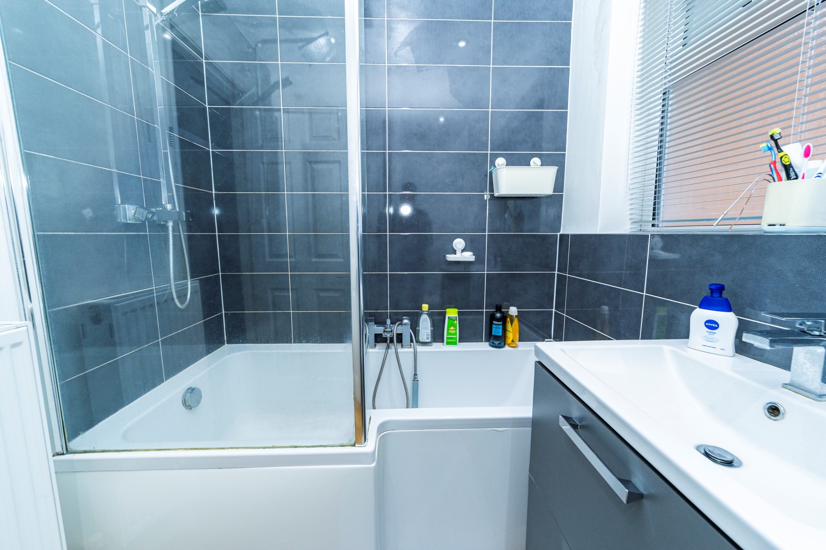 Family Bathroom – Fitted with a suite of panelled 'P' shaped bath with power shower over, wash hand basin set into a vanity unit, low flush WC, ceramic tiling, radiator,, extractor fan, , UPVC double glazed window to the rear elevation.