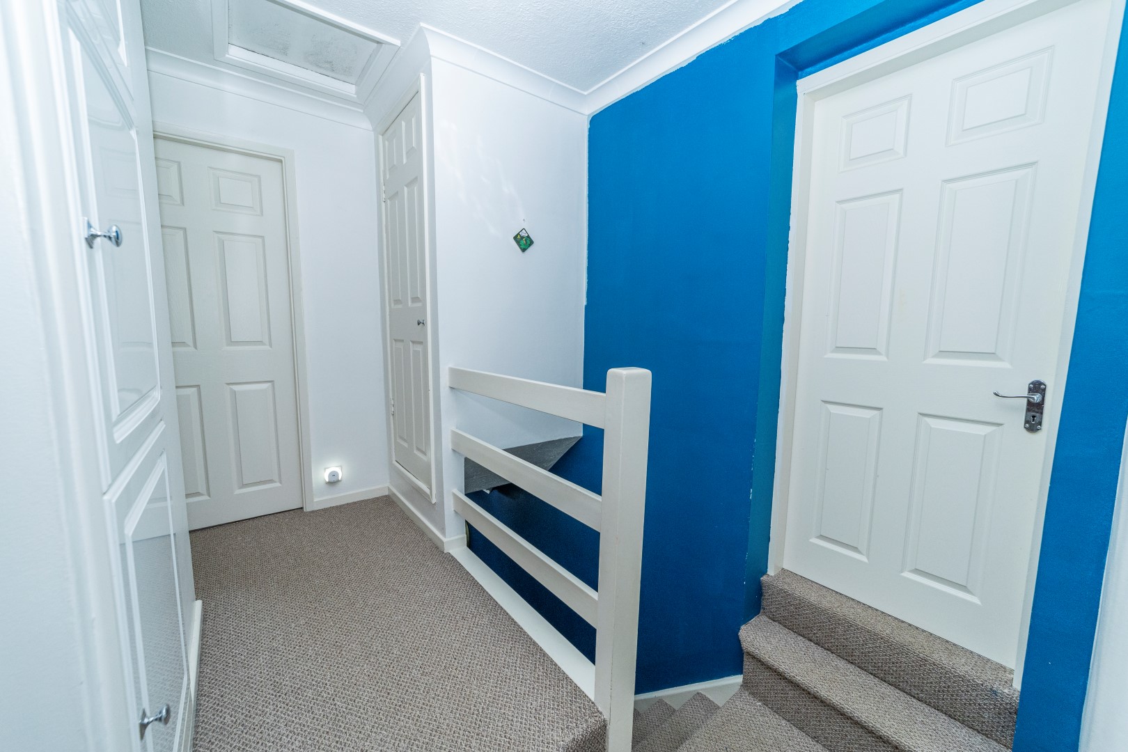 First Floor Landing- An airing cupboard with gas fire combination boiler , loft access, store cupboard over the stairs and doors leading to-