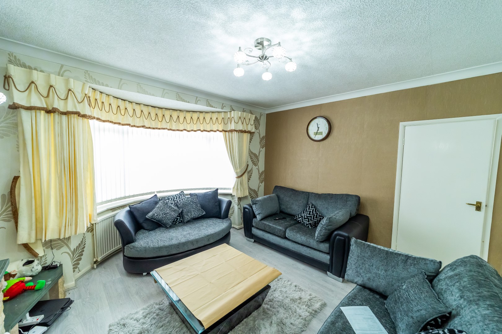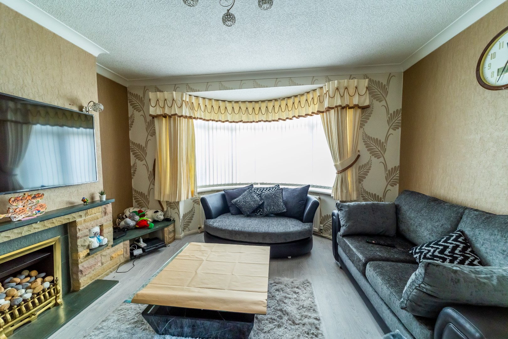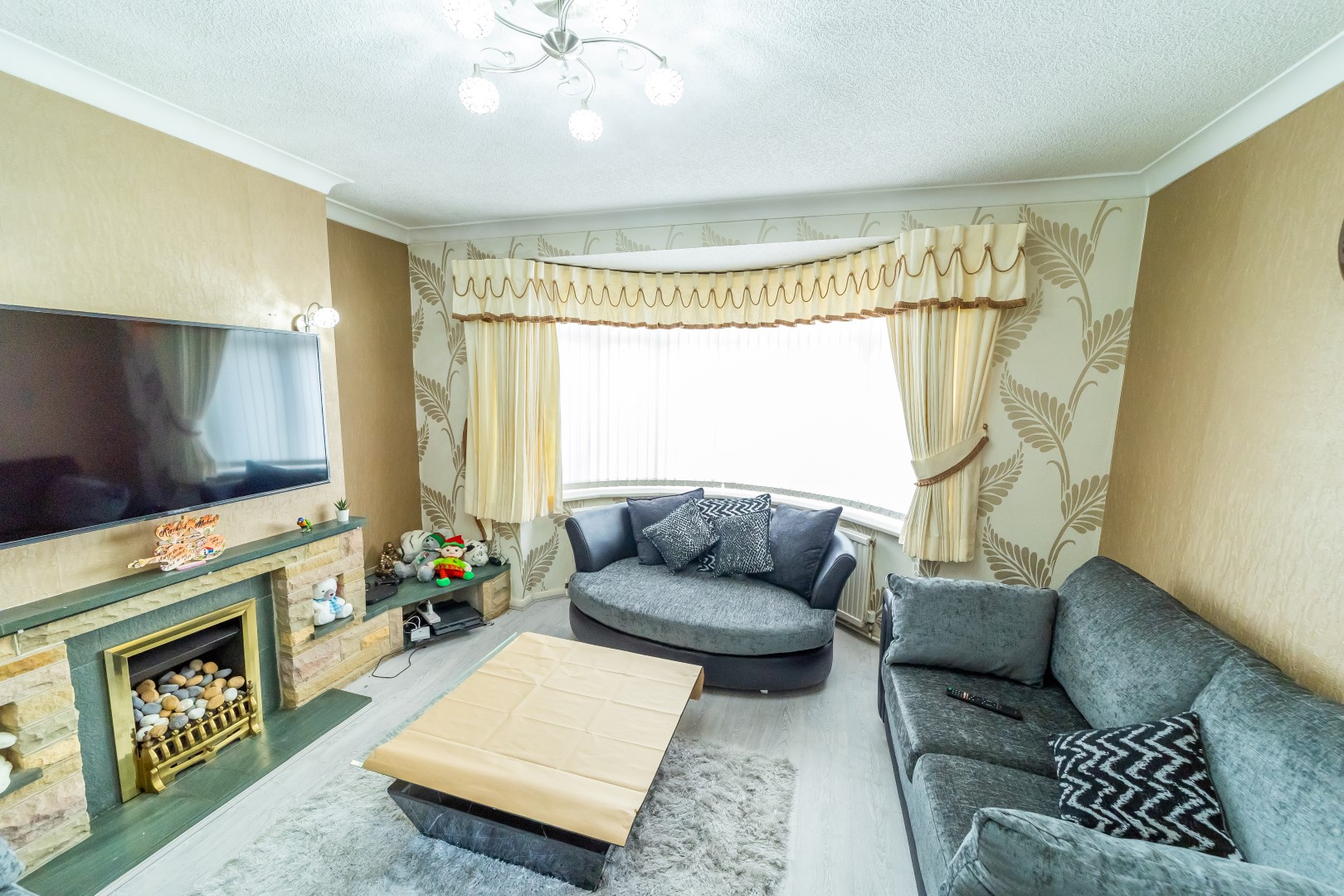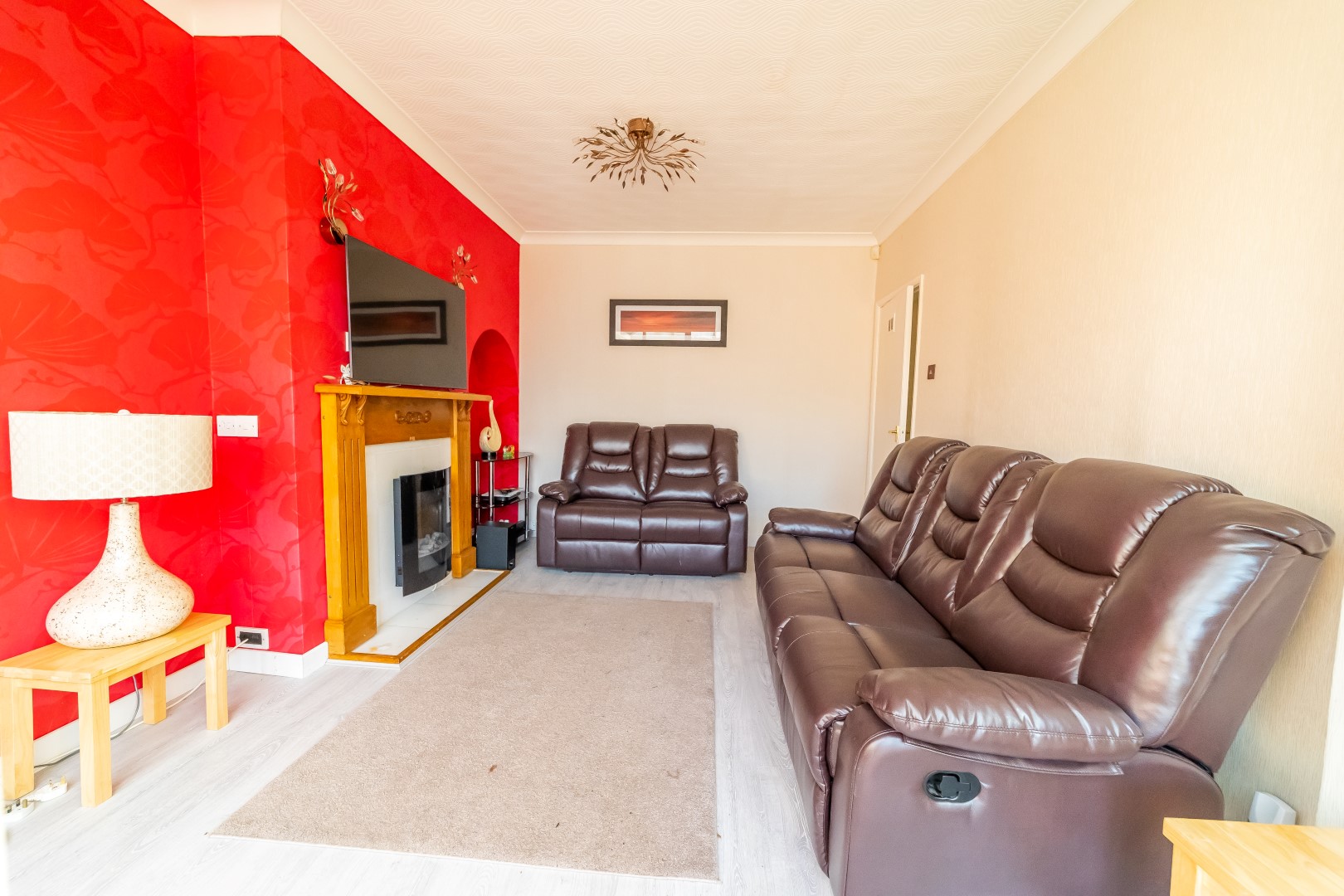 Lounge : 12'5" x 13' fitted with gas fire with surrounds, radiator, window to front elevation, Tv point, power points