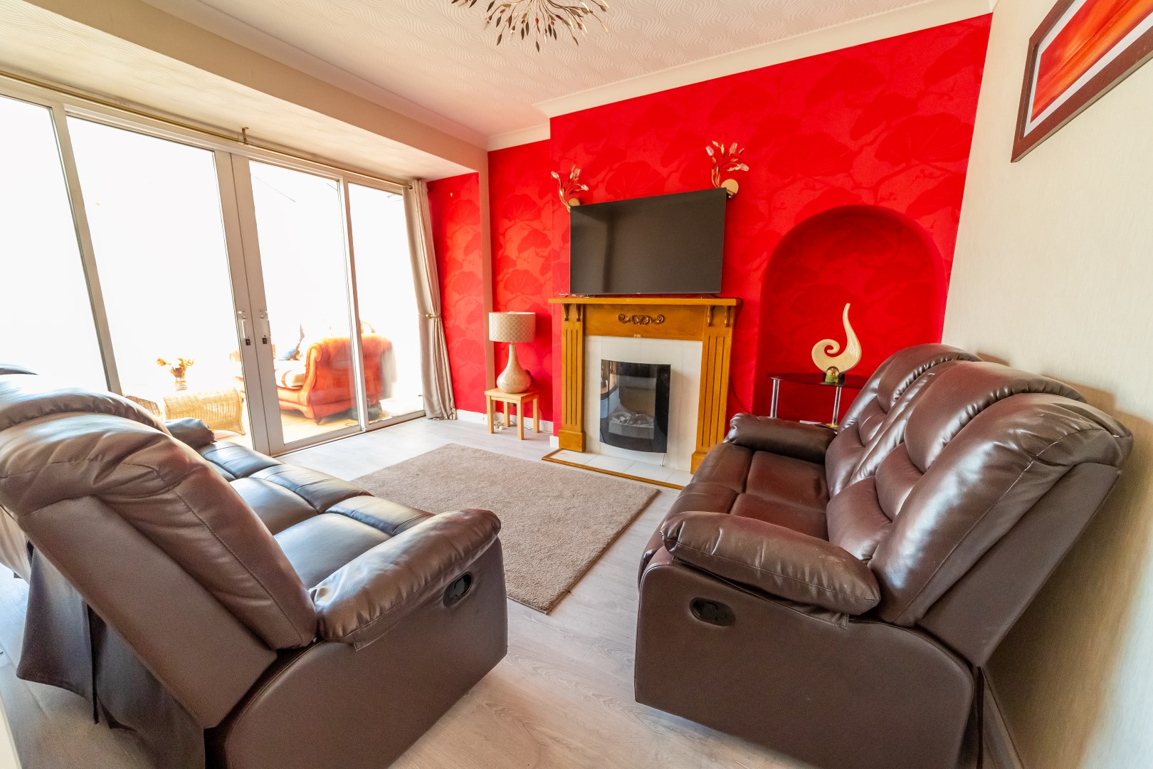 Family room: 13'8" x 11'11" fitted with gas fire, radiator, power point, Tv point, patio door leading to conservatory